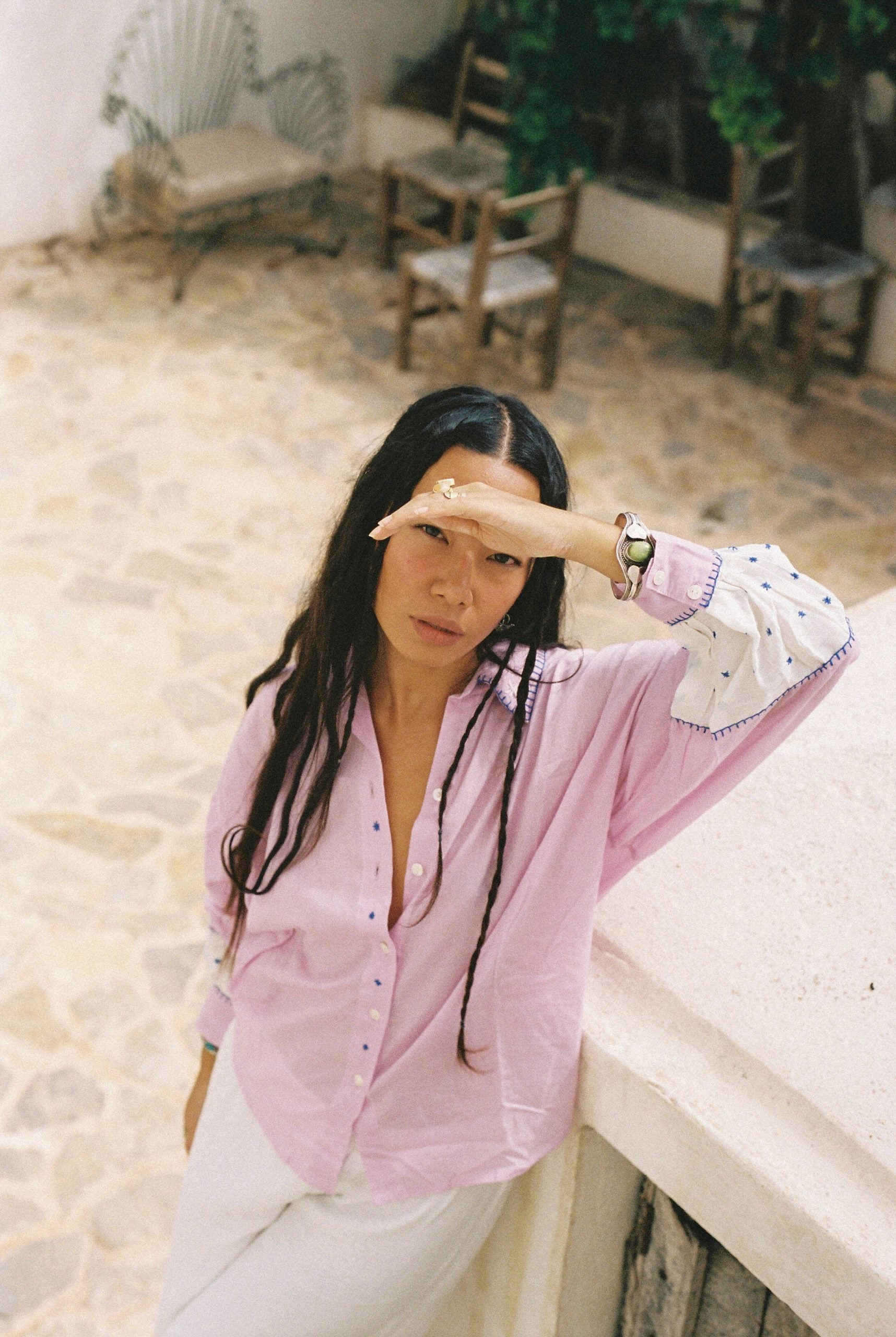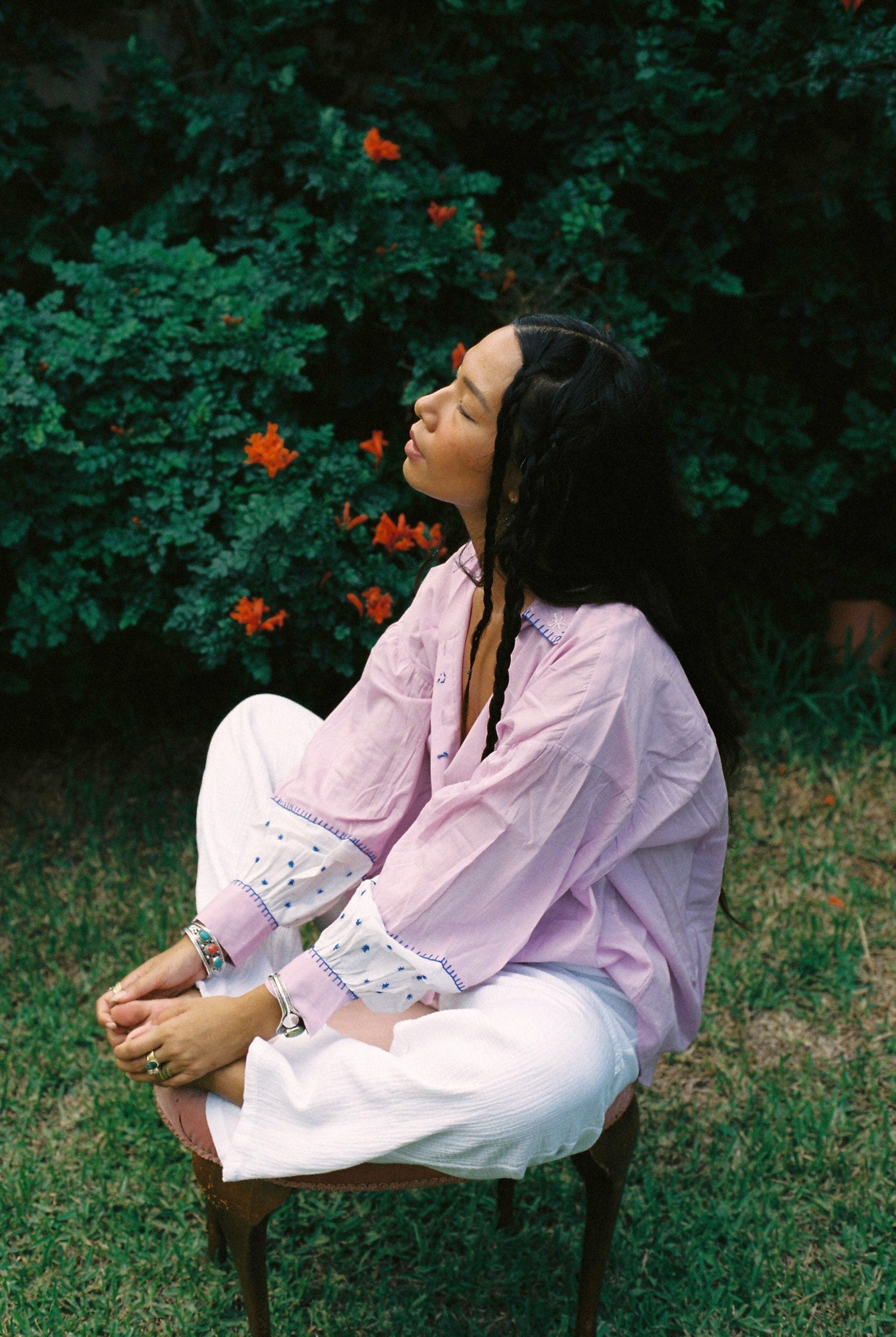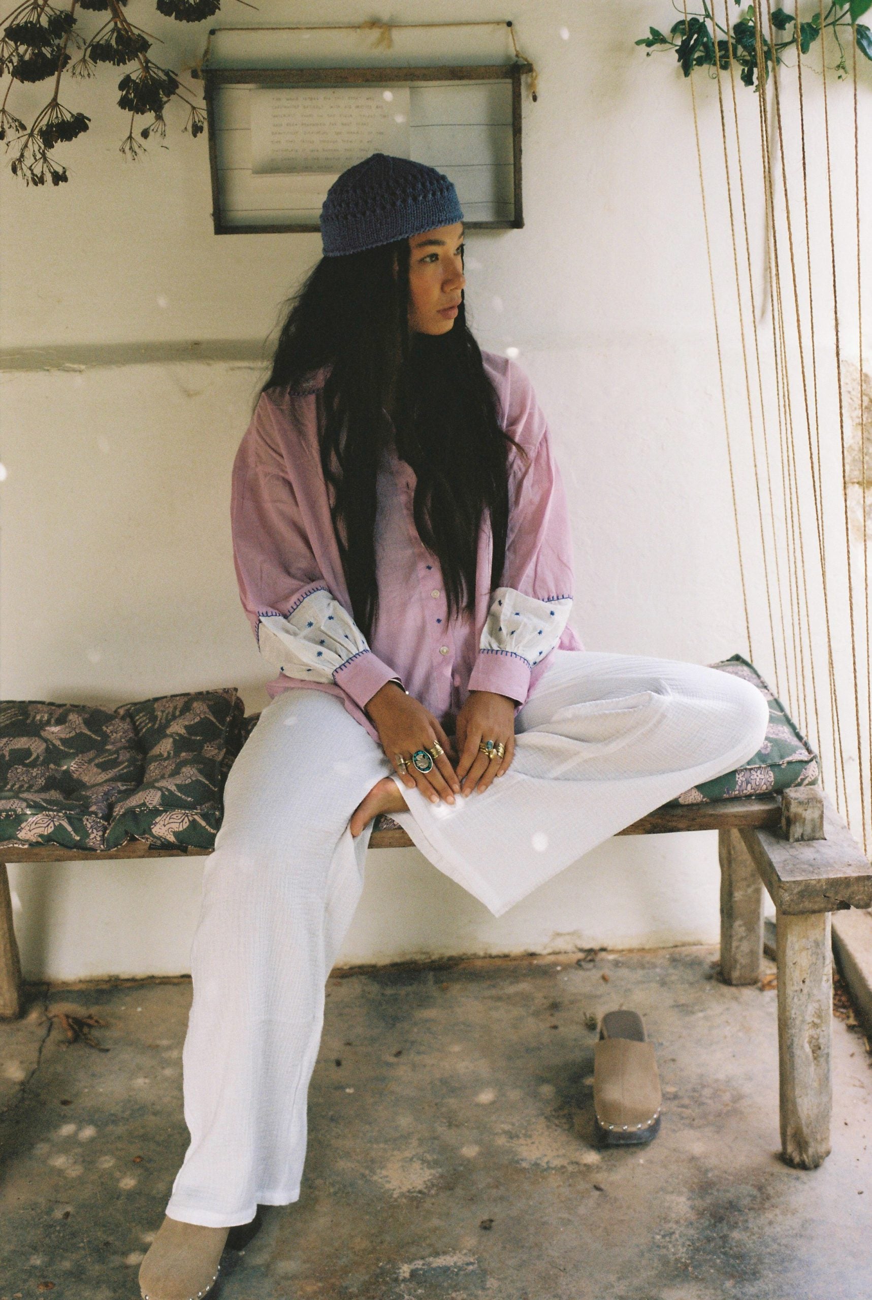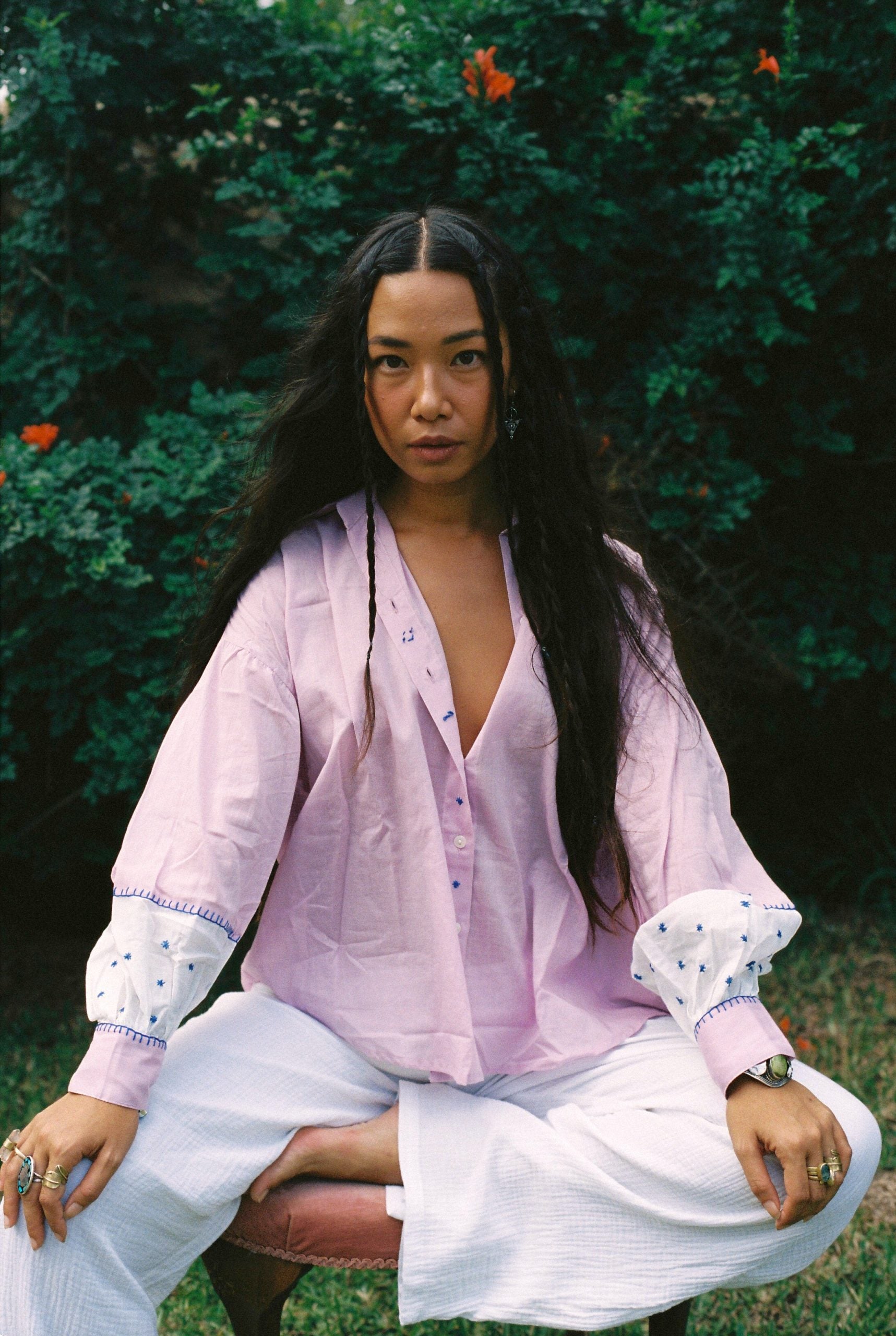 Bordado a mano en colaboración con una familia de artesanos en Rajastán.