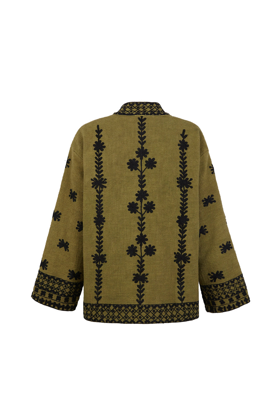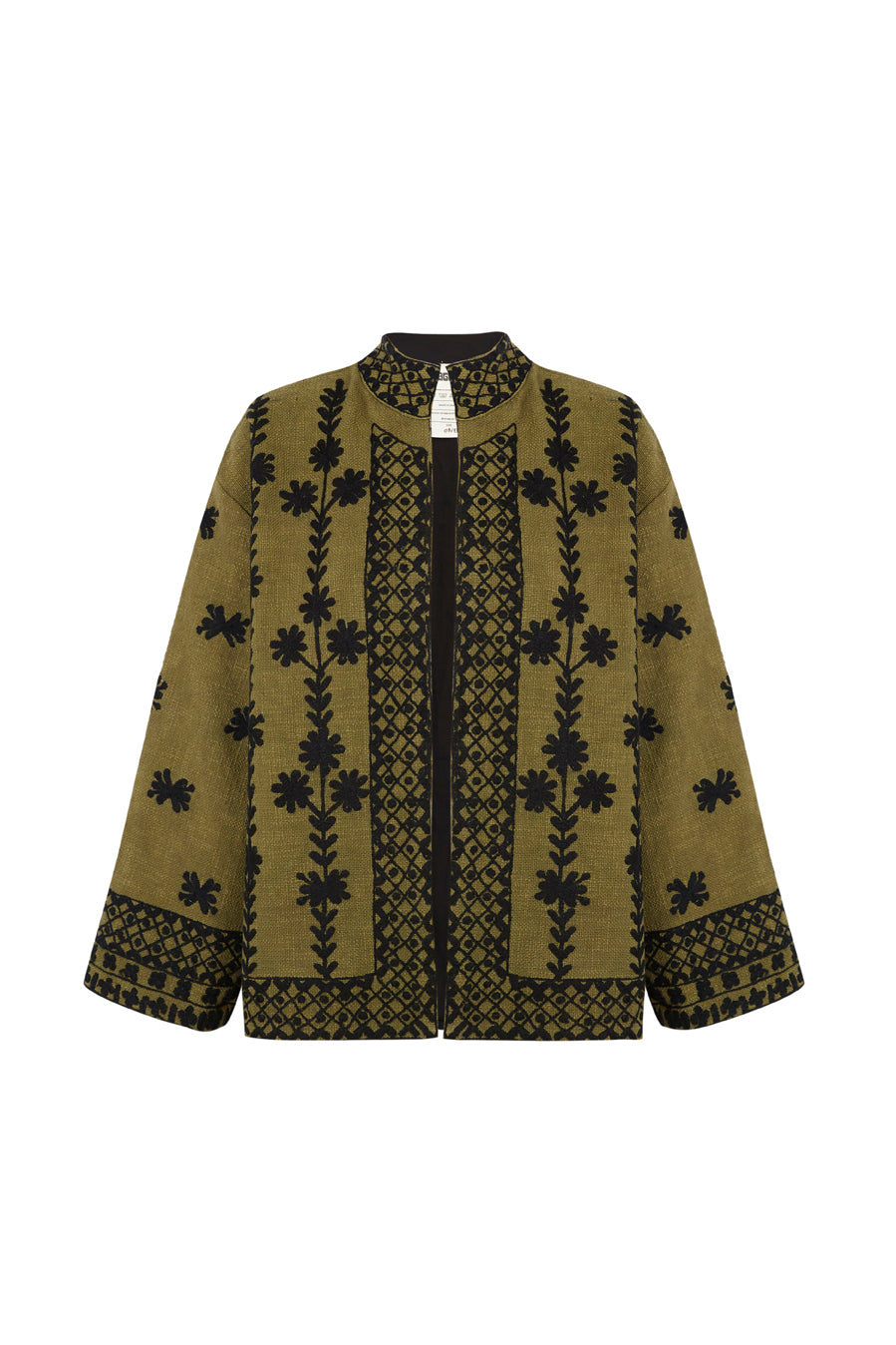 Es un diseño bordado sobre un algodón mezclado de tacto suave y natural. Cada chaqueta es una pieza única por lo que el bordado podría variar ligeramente en cada ocasión.