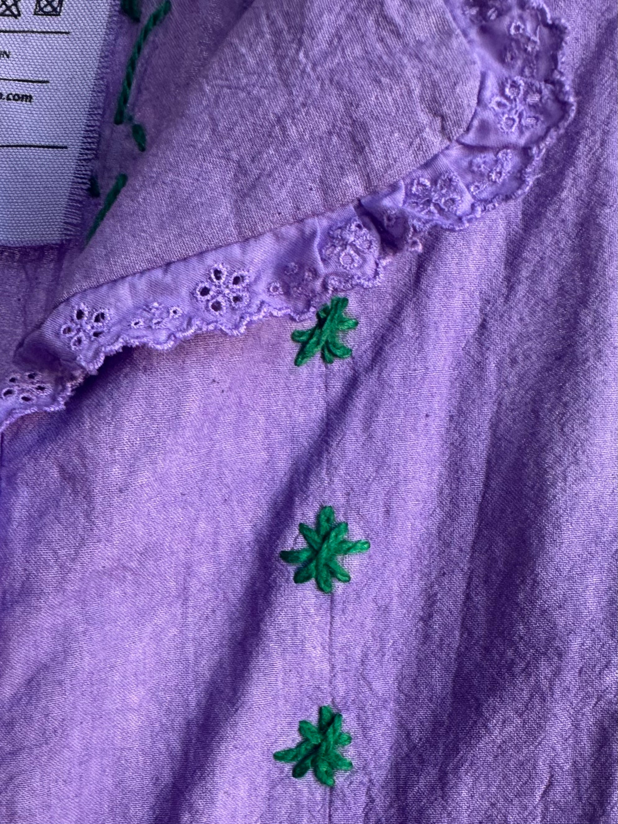 Cada uno de nuestros tejidos ha sido seleccionado cuidadosamente por nosotros. Por favor, para mantener la calidad del tejido lávalo a mano o a máquina en frío junto a un detergente suave. Dale el mimo que merece y deja la prenda secar a la sombra. Si la luz del sol es demasiado fuerte puede dañar nuestros tejidos teñidos a mano con tinte natural. No planchar directamente sobre el bordado. En el caso de utilizar un steamer planchar por el lado interno. En el caso de usar una plancha común utilizar una tela de algodón encima y planchar sobre ella para no dañar el bordado. No utilice la secadora. Los tejidos podrían encoger si lo lavas a temperatura alta.