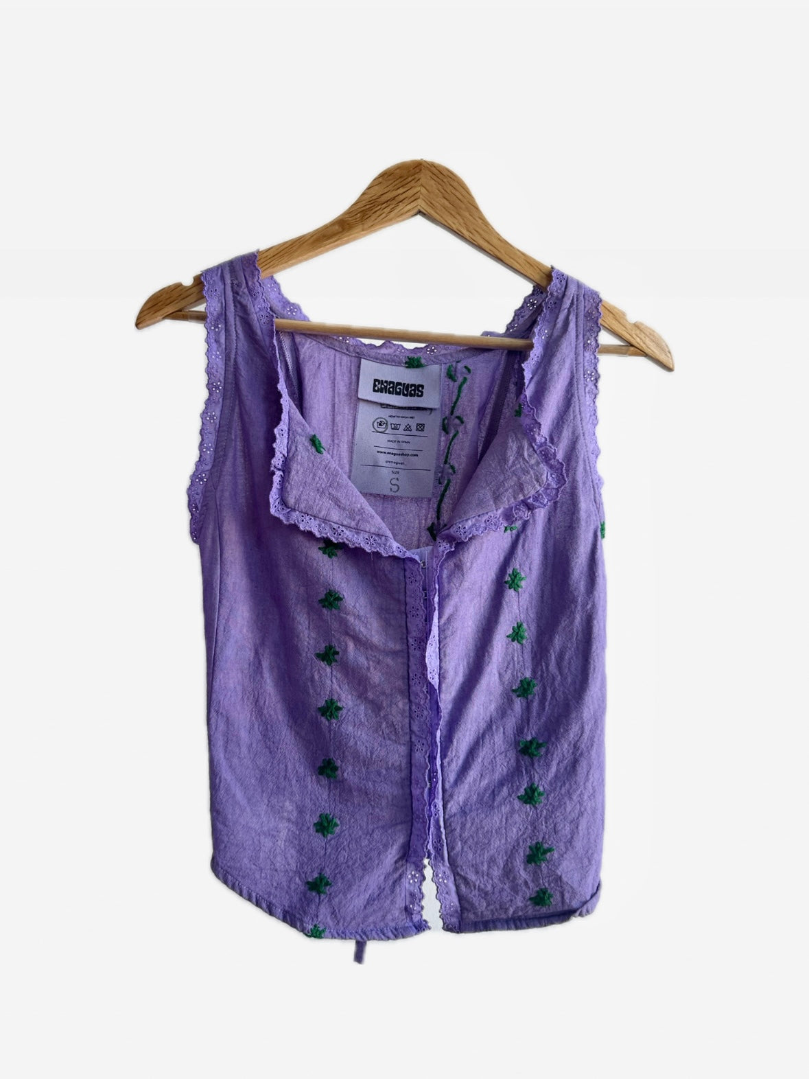 Es un diseño bordado a mano sobre un algodón suave y natural de alta calidad. Cada top es una pieza única por lo que el bordado podría variar ligeramente en cada ocasión.